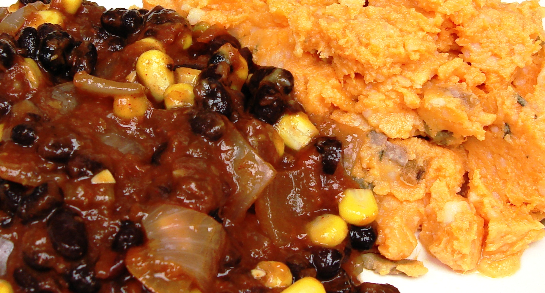 Black bean chili; Bubble and Squeak (mashed potato, leek and cabbage)