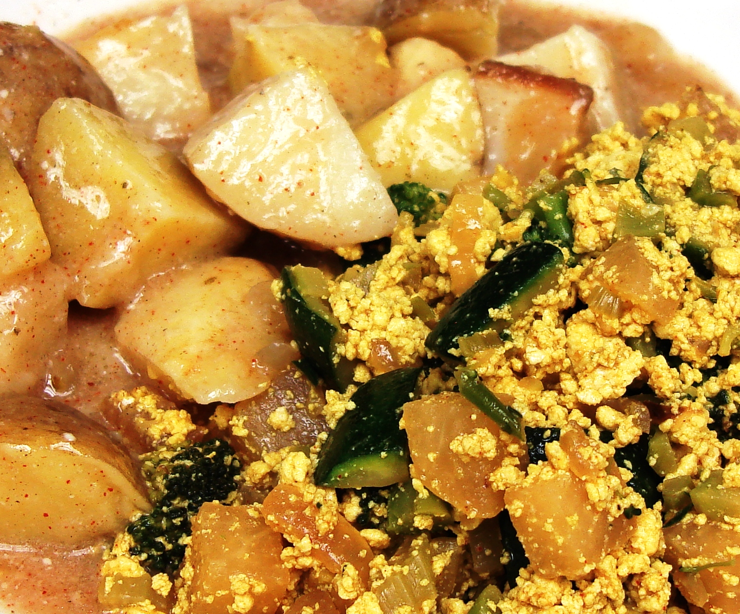 Tofu Spring Salad (miso-tahini dressing); Roasted roots with collards, rye and fresh rosemary