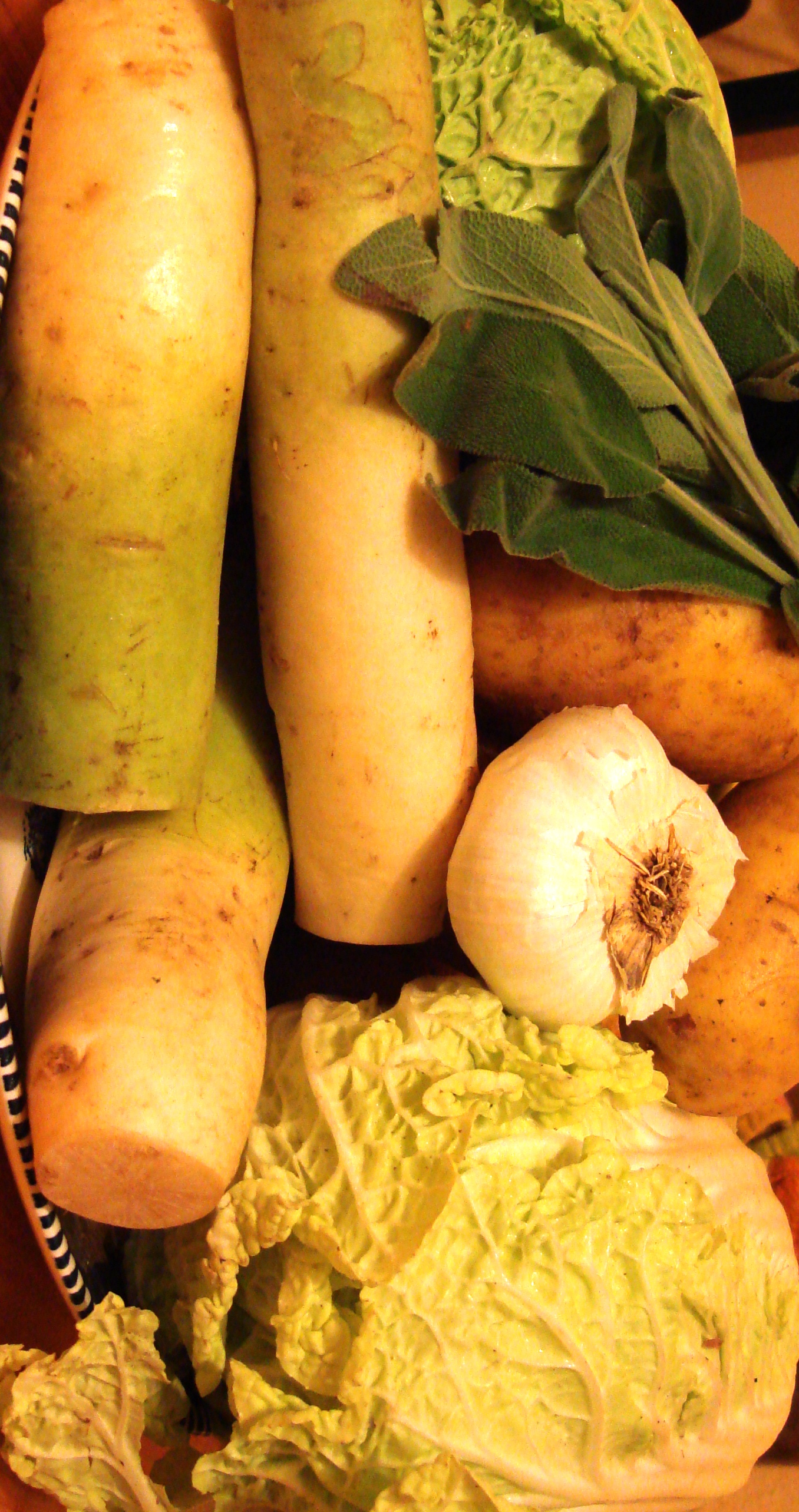 We needed those warming spices last week! This week we still are cooking with some Iowa grown produce; potatoes, sweet potatoes, daikon radish, napa and savoy cabbage, red curi and butternut squash, sage. These were not found at obscure markets but at New Pioneer Food Co-op. We’ll continue to aid the body’s digestion with cooked, especially roasted vegetables with the warming herbs and spices like garam masala, garlic and black papper, giving the body an extra kick. We are generous with onions in the winter too, as they help kick start a sluggish system with their liver cleansing properties.