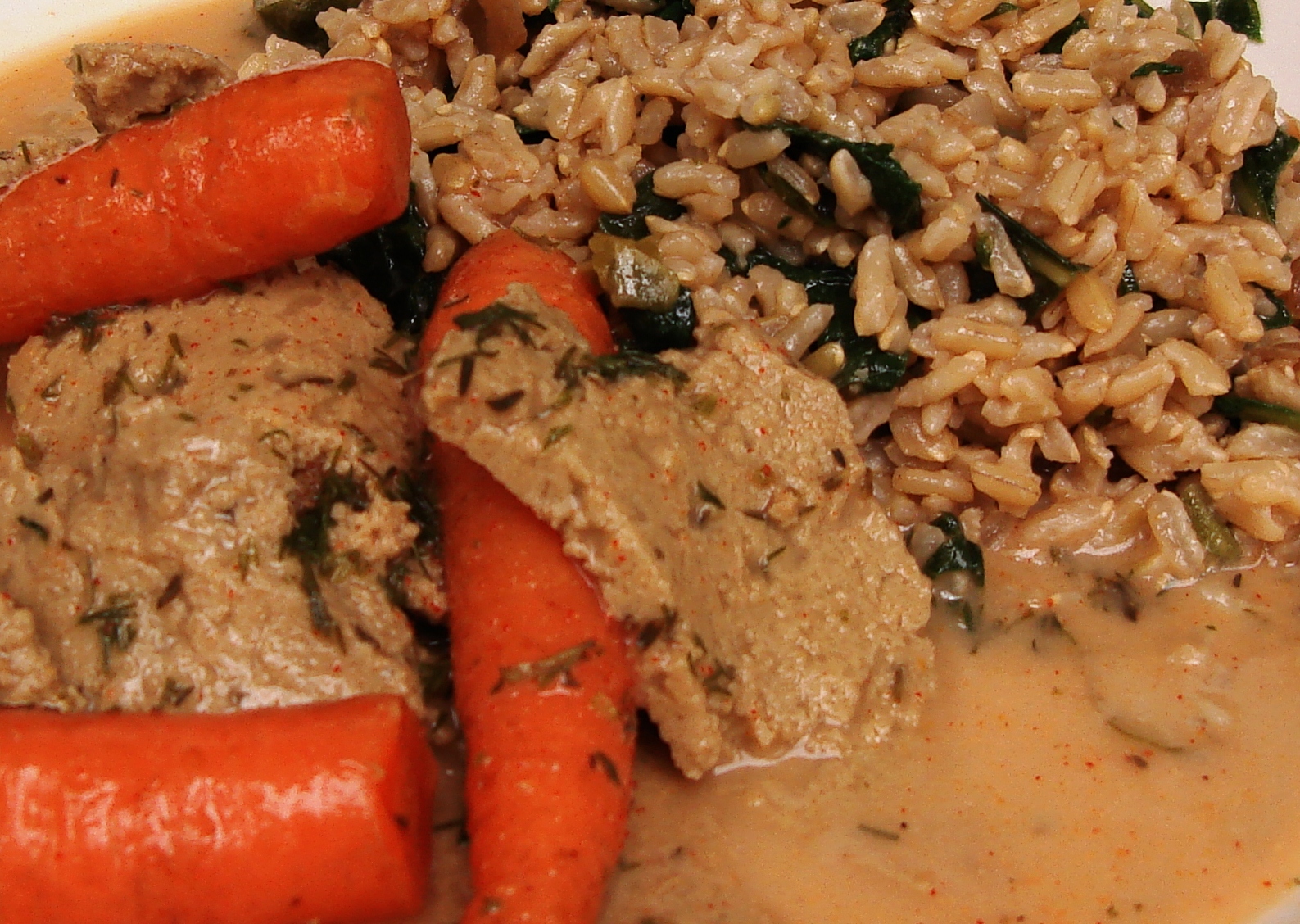 - Seitan with lemon dill sauce and butternut squash; Red beet and sweetcorn pink rice paella